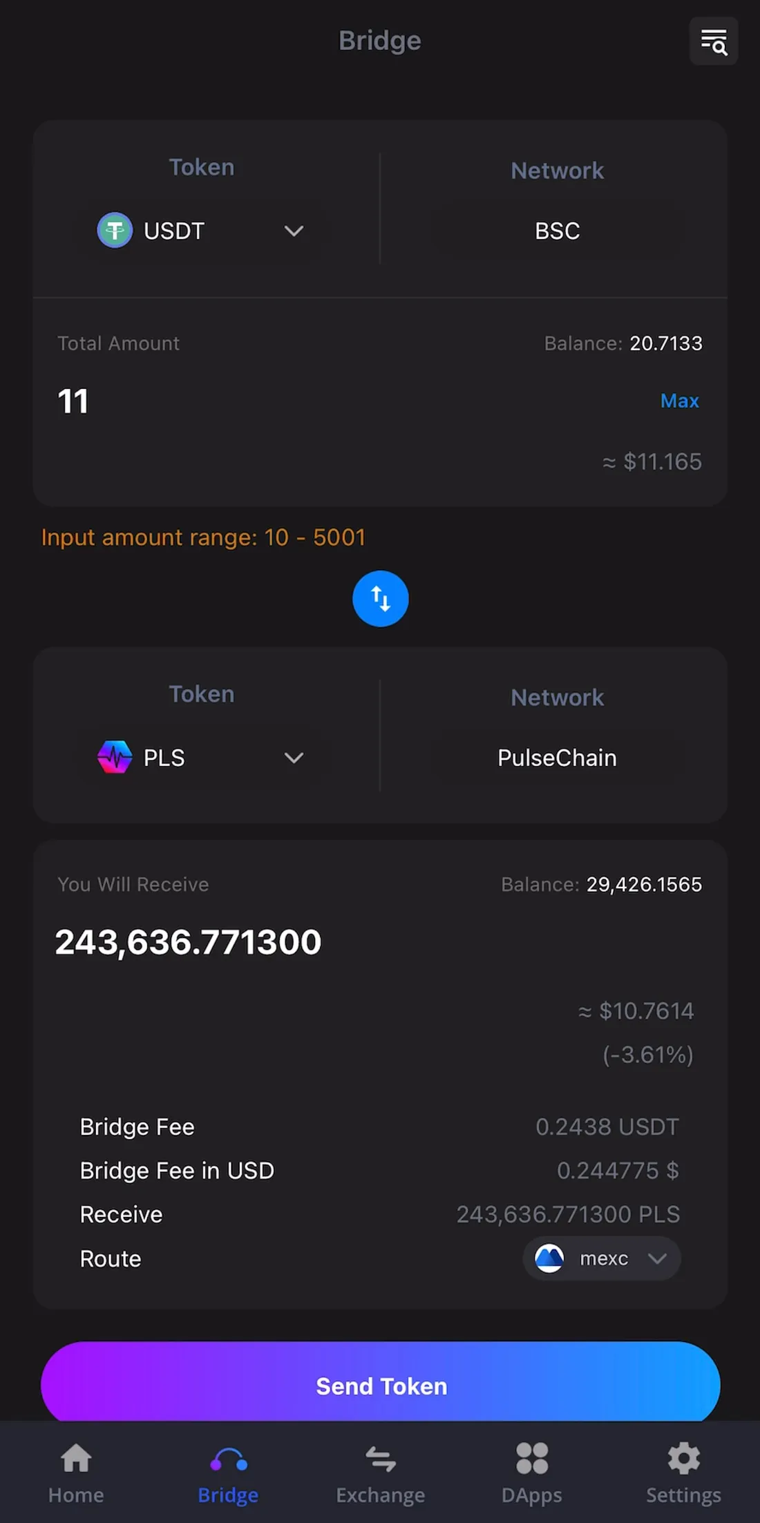 Step 5: Confirm the amount and click “Send Token.” Your USDT will be converted to PLS on PulseChain.